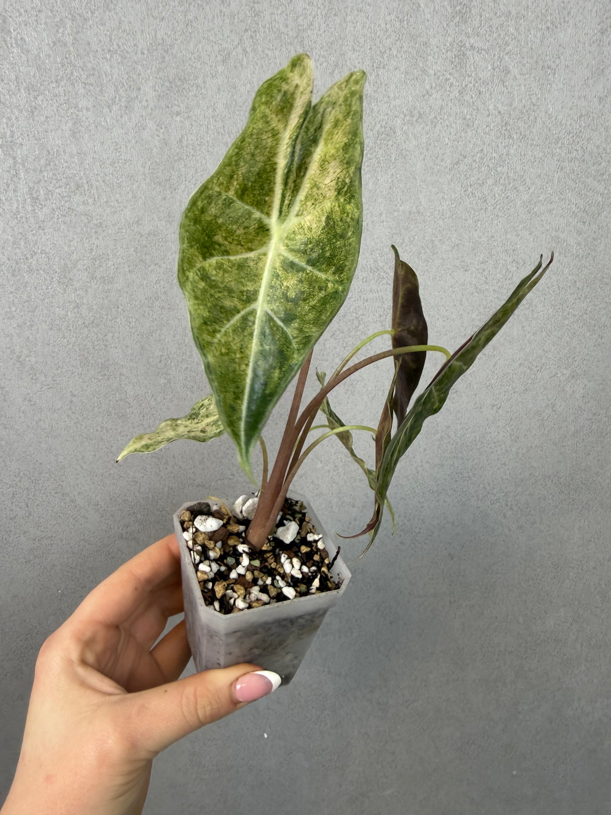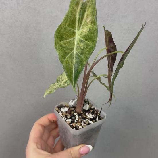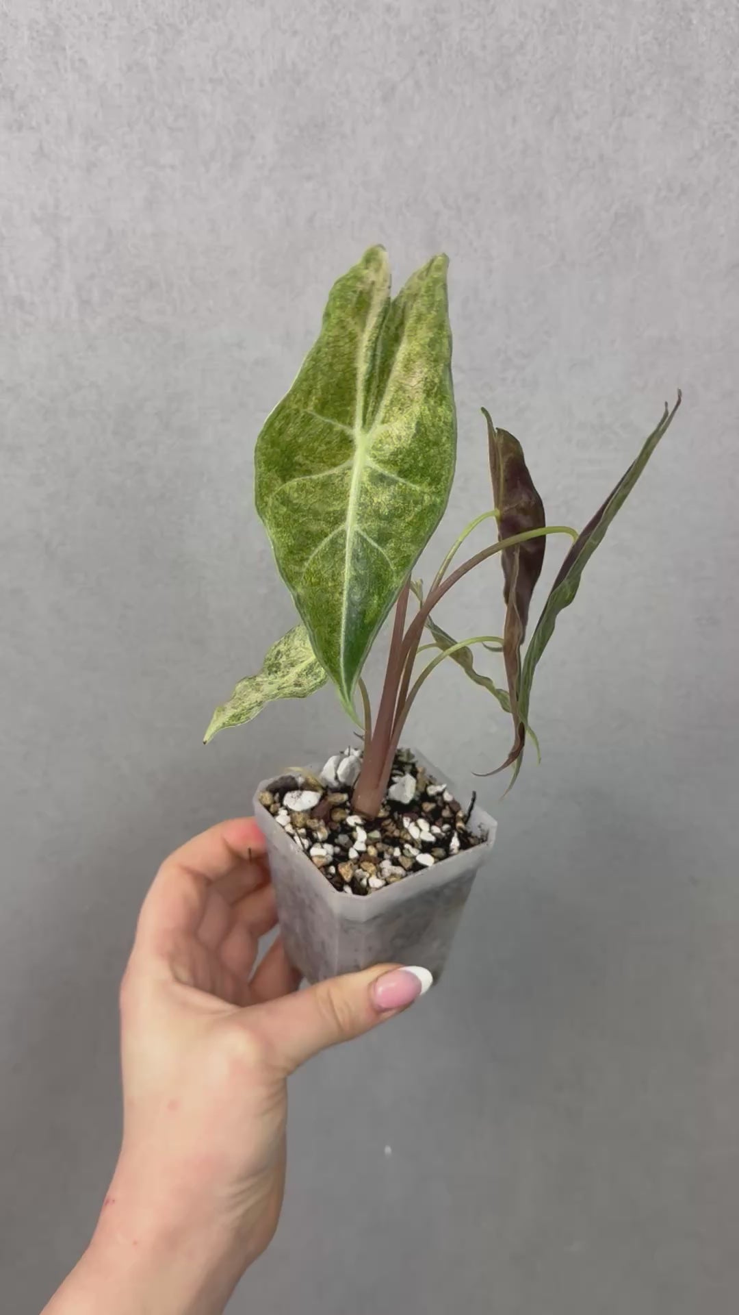 This Alocasia Black Satun Stardust is cultivated directly from corm, ensuring genetic consistency and vitality. Its highly variegated leaves exhibit unique patterns, enhancing aesthetic appeal while contributing to the plant's health. This species thrives in environments with high humidity, promoting robust growth and longevity.